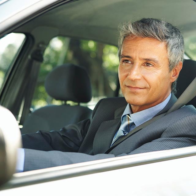 Hombre de traje saliendo del auto en la calle mientras el chofer le abre la puerta